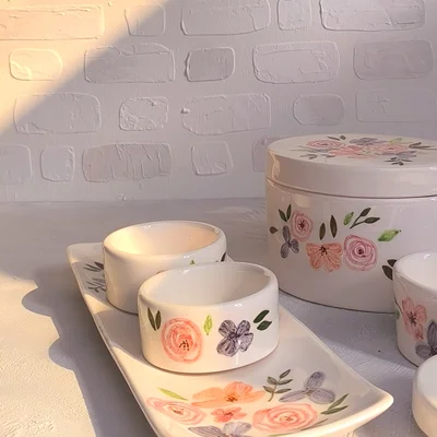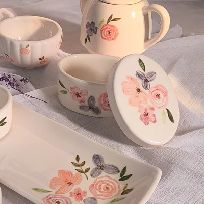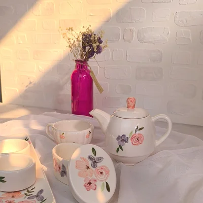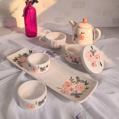 کار خودتون را با هنر آغاز کنید.هر وعده صبحانه یا عصرانه، به تجربهای زیبا و دلنشین تبدیل میشه.- هر قطعه این ست با دستای هنرمند خلق شده- از خاک سرامیک مرغوب و لعاب غیرسمی برای سلامت و کیفیت بیشتر ساخته شده- طرح خاص و رنگهای آرامشبخش، هماهنگ با فضای دلپذیر صبح- شامل فنجان، قوری و قندان بیضی، کاسه برای مربا و عسل مناسب برای یک وعده صبحانه کامل. این ظروف میتونه **هدیهای خاص:** باشه برای کسایی که به ظرافت و اصالت اهمیت میدهند.