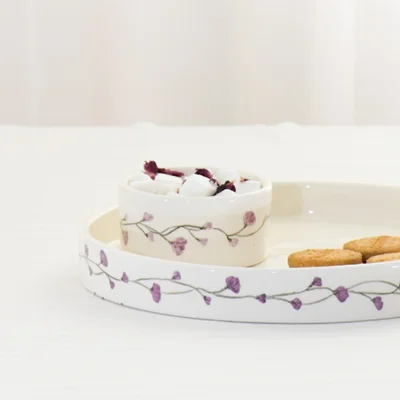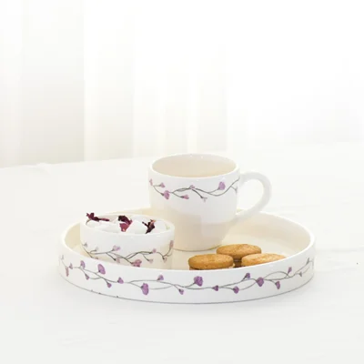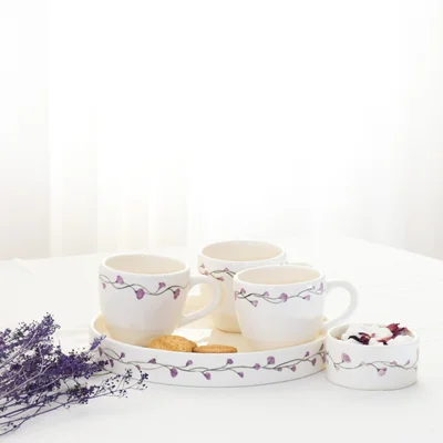 این ست سه نفره زیبا شامل ۳ فنجان ، یک قندان ، یک سینی سرو سرامیکی است که کاملا با دست نقاشی شده و نوشیدنی در فنجان های آن طعم آرامش دارد ، رنگ بنفش و خاص این مجموعه زیبایی آن را دو چندان می کند .