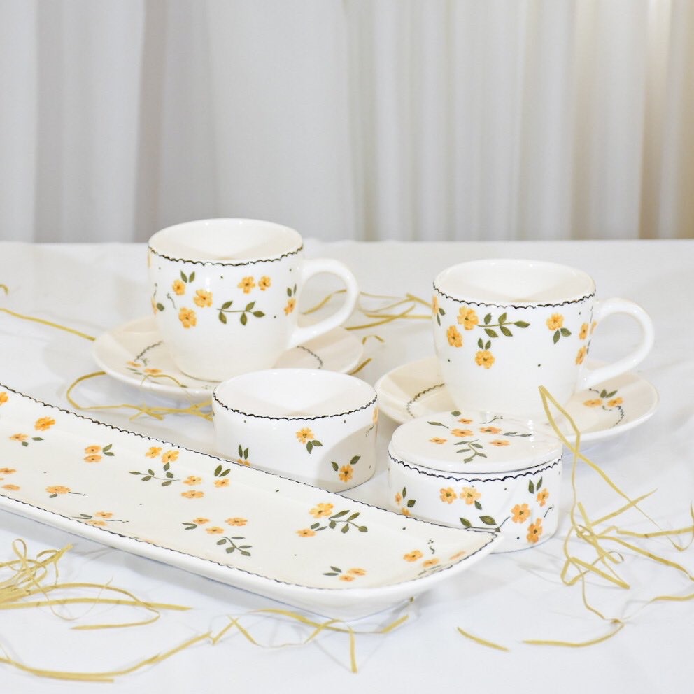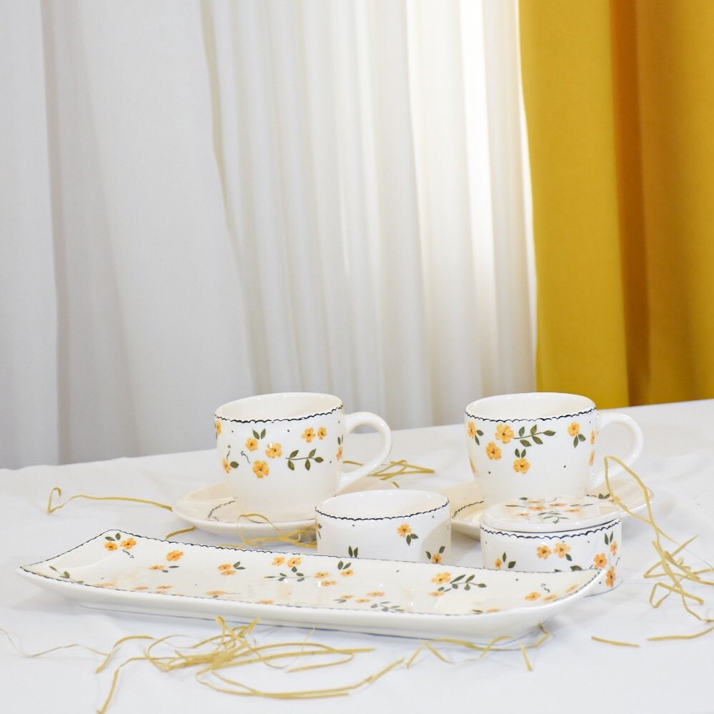 ست سرامیکی پذیرایی با طرح گلهای زرد، انتخابی شیک و دلنشین برای میز شماست. این مجموعه شامل دو فنجان سرامیکی همراه زیر فنجانی، یک ظرف کشیده مناسب شیرینی یا شکلات، و دو ظرف گرد کوچک به همراه یک درب چوبی برای نگهداری مواد خوراکی است. طراحی ظریف گلهای زرد و برگهای سبز روی بدنه، زیبایی کلاسیک و احساس گرما و صمیمیت را به میز شما میآورد.هر قطعه از این ست به صورت دستساز تولید شده و مناسب برای استفاده روزمره و پذیرایی مهمانان است. جنس سرامیک با کیفیت بالا، دوام طولانی و تمیزی آسان را تضمین میکند.